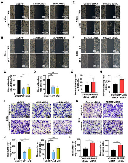 The role of PRAME expression on cell migration and invasion (A,B). The wound-healing rate in PRAME-silenced C33A and SiHa cells. (C,D) The quantitative results for (A,B). (E,F) The wound-healing rate in PRAME-overexpressed C33A and SiHa cells. (G,H) The quantitative results for (E,F). (I) The number of migratory and invasive cells in PRAME-knockdown SiHa cells. (J) The quantitative results for (I). (K) The number of migratory and invasive cells in PRAME-overexpressed SiHa cells. (L) The quantitative results for (K). * p < 0.05, *** p < 0.001.