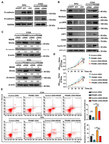 Regulation of EMT-related proteins and Wnt/β-catenin pathway by PRAME expression in cervical cancer cells. (A) The change in E-cadherin and N-cadherin expression in PRAME-knockdown SiHa and PRAME-overexpressed C33A cells. (B) Western blotting analysis of Wnt/β-catenin signaling pathway-related protein expression after PRAME knockdown in SiHa cells and PRAME overexpression in C33A cells. (C) Western blotting analysis of Wnt3a and β-catenin expression in PRAME-overexpressed C33A and SiHa cells after MSAB treatment. The results of gray value quantification are displayed below the corresponding bands. (D) The cell viability in PRAME-overexpressed and control C33A and SiHa cells with MSAB treatment. (E) Left panel: The cell apoptosis in PRAME-overexpressed and control C33A and SiHa cells with MSAB treatment. Right panel: The quantitative results. *** p < 0.001.