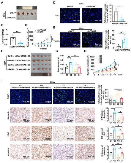 The effect of PRAME on tumor growth via Wnt/β-catenin pathway in vivo. (A) The image of xenografts injected with PRAME-knockdown SiHa cells and control SiHa cells. (B) The weight of the xenografts in PRAME-knockdown group and control group. (C) The growth curves of xenograft tumors of PRAME-knockdown group and control group. (D) The immunofluorescence staining of Ki67 in tumor slices. (E) The immunofluorescence staining of TUNEL assay in tumor slices. (F) The image of xenografts injected with PRAME-overexpressed C33A cells and control C33A cells after the MSAB therapy. (Tumor groups as G1: Control cDNA+DMSO, G2: PRAME cDNA+DMSO, G3: Control cDNA+MSAB, and G4: PRAME cDNA+MSAB). (G) The weight of the xenografts in PRAME-overexpressed group and control group with or without MSAB therapy. (H) The growth curves of the xenografts in PRAME-overexpressed group and control group with or without MSAB therapy. (I) The TUNEL and IHC staining of tumor tissues. * p < 0.05, ** p < 0.01, *** p < 0.001.