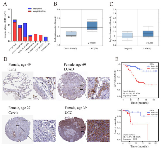 Previous studies have reported that IDH3α is up-regulated in many cancers [11,19]. In the cBioPortal database, we found that amplification was the major genomic change in IDH3α in UCC and lung cancer (Figure 1A). By using the Oncomine database, we confirmed that the expression of IDH3α in UCC and LUAD tissues was significantly higher than that in non-cancerous tissues (Figure 1B,C). In addition, compared to normal tissues in the HPA database, the protein expression levels of IDH3α were higher in uterine cervical and lung cancer tissues (Figure 1D). High expression levels of IDH3α were associated with poorer overall survival in UCC and LUAD patients (Figure 1E).