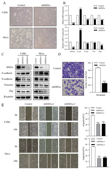 Next, lentivirus was used to knock down IDH3α in CaSki cells, and differentially expressed genes (DEGs) were analyzed by using RNA-seq (Figure S1A,B). We undertook KEGG pathway and GO analyses that focused on the cell migration and invasion, in response to the immune system (Figure S1C,D). We also found a significant difference in the expression of epithelial–mesenchymal transition (EMT)-related markers (Figure S1E).