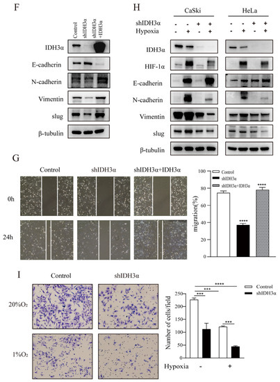 IDH3α knockdown inhibited the EMT and disrupted EMT-related biomarkers in UCC cells. (A) Morphological changes in CaSki and HeLa cells were observed under a phase contrast microscope. (B,C) qPCR (B) and WB (C) were used to detect E-cadherin, N-cadherin, vimentin, and slug in UCC cells. (D) Scratch assay and histogram statistics (right) show that the downregulation of IDH3α inhibited CaSki and HeLa cell migration ability. (E) Transwell cell invasion assays and histogram statistics (right) used for HeLa-shIDH3α and control cells. (F) WB was used to detect EMT-related marker expression after knocking down IDH3α expression and re-expressing it in CaSki cells. (G) The scratch assay was used to detect cell migration ability after knocking down IDH3α expression and re-expressing it in CaSki cells. (H) Expression of EMT-related markers under hypoxia was detected by using WB. (I) The invasion ability of cervical cancer cells detected by the transwell assay under hypoxia. Data are shown as mean ± SD. *** p < 0.001 and **** p < 0.0001.