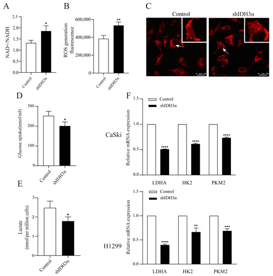 The effects of IDH3α knockdown on redox status and glycolysis ability. (A) NADH oxidase activity was assessed in H1299 cells. (B) ROS detection was assessed by using the Cellular Reactive Oxygen Species Detection Assay Kit (Red Fluorescence) in H1299 cells. (C) Confocal microscopy visualization of mitochondrial morphology after mitochondrial staining with the mitochondrial tracker red CMXRos in HeLa cells. Arrows represent mitochondria. (D) Glucose uptake in H1299-shIDH3α and control cells. (E) Lactate concentration in H1299-shIDH3α and control cells. (F) Glycolysis-related markers were detected by quantitative PCR. Data are shown as mean ± SD. * p < 0.05, ** p < 0.01, *** p < 0.001 and **** p < 0.0001.