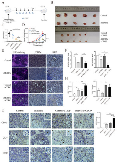 Effects of IDH3α on tumor growth in vivo and CD8+T cell infiltration proportion in tumor tissues after cisplatin treatment. (A) In vivo experimental design. U14 mouse cervical cancer cells were transduced with lentivirus and injected into the inguinal region of C57BL/6 wild-type mice (5 × 106 per mouse). Cisplatin (5 mg/kg per mouse) was injected intraperitoneally on days 1, 3, 5, 7, and 10. (B–D) Images of subcutaneous tumor and growth curve of tumor tissue weight and volume (n = 5/group). (E,F) Tumor tissues were collected, fixed with formaldehyde, sectioned, and examined using H&E staining. Immunohistochemical and quantitative analysis of Ki67 and IDH3α. (G,H) Immunohistochemical and quantitative analysis of CD45+, CD4+, and CD8+T cells in tumor tissues. * p < 0.05, ** p < 0.01, *** p < 0.001, and **** p < 0.0001.