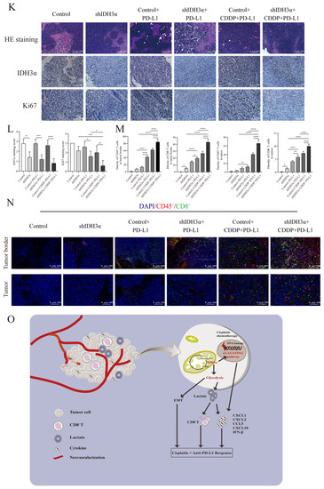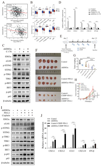 To further verify the relationship between IDH3α expression and the immune microenvironment cell distribution, a tumor-bearing animal model was established according to the experimental scheme shown in Figure 7E, and the effect of IDH3α expression on tumor growth was observed after different treatments. Compared to that in the control group, the tumor weight was significantly reduced (Figure 7G), and tumor growth curves were suppressed in the shIDH3α group (Figure 7H), especially in the shIDH3α+CDDP+PD-L1 group. Then, we detected cGAS–STING-pathway-related protein expression in the tissues of each experimental treatment group. The results show that the expression of cGAS, p-STING, p-TBK1, p-IRF3, and p-p65 increased mostly in the shIDH3α + CDDP + PD-L1 group (7I). As detected by qPCR, significantly increased mRNA expression levels of CXCL1, CXCL2, CCL5, CXCL10, and IFN-β were detected in tumor tissues isolated from the shIDH3α + CDDP + PD-L1 group compared to the control+CDDP+PD-L1 and shIDH3α groups (Figure 7J). Immunohistochemical (IHC) staining of sections and quantitative analysis showed that the expression of the proliferation marker Ki67 was significantly decreased after IDH3α knockdown (Figure 7K,L). Previous studies have reported that CD8+T cells play a major role in the effect of tumor immunotherapy [23]. The silencing of IDH3α alone increased CD8+T immune cells at the tumor periphery and at the tumor center, while the combination with CDDP+ anti-PD-L1 Abs resulted in significantly higher proportions than treatment alone or control (Figure 7M,N). The results show that silencing IDH3α could effectively trigger the activation of the cGAS–STING pathway and increase immune cell distribution in the TME.