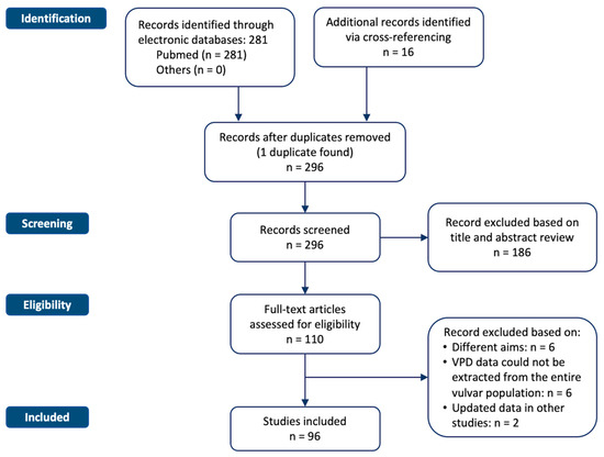 We considered as exclusion criteria the following: (1) primary vulvar tumors other than VPD; (2) secondary VPD; (3) cases with an uncertain diagnosis; (4) synchronous tumors; (5) studies focusing exclusively on histopathological, immunohistochemical, and molecular aspects; (6) studies with different aims than the analysis of treatment and outcome measures; (7) reviews, systematic reviews, meta-analyses, guidelines, books, editorials, letters, comments, conference abstracts, and preliminary studies with animal models.