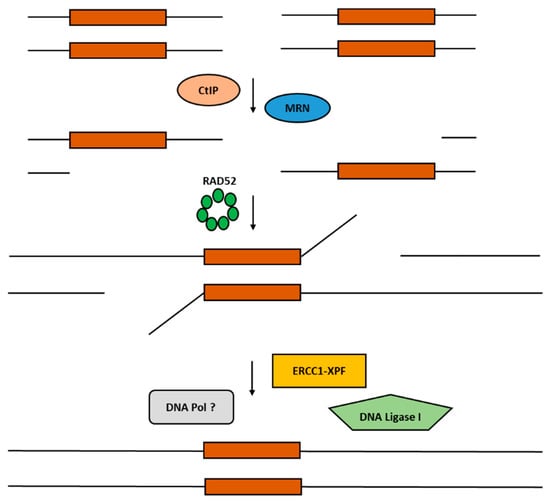 As shown in Figure 1 and such as HR, SSA begins with the resection of DNA ends and the creation of 3′ overhangs thanks to the nuclease activity of Mre11/Rad50/Nbs1 (MRN) and C-terminal binding protein 1 (CtBP1) interacting protein (CtIP) complexes [15,16,17]. Additionally, other helicases and nucleases can be recruited to generate longer single stretches (e.g., DNA2, Bloom Syndrome Protein (BLM), Exonuclease I (EXO1), Werner Syndrome Helicase (WRN), and RecQ-Like Helicase) [18]. RAD52 is then recruited on the resected DNA ends to promote their annealing and to recognize the ssDNA region of homology (<30 bps). Following the annealing in the homology regions, the Excision Repair Cross-Complementation Group 1 (ERCC1)-Xenoderma Pigmentosum Complementation Group F (XPF) complex binds RAD52’s N-terminal domain and cleaves nonhomologous 3′-ssDNA flap ends [19,20]. RAD52 seems to stimulate ERCC1-XPF nuclease activity [19]. Then, DNA polymerases fill any gaps, and DNA ligase I blends the DNA strands to complete the SSA process. Researchers have not yet identified and characterized all the polymerases and ligases involved in SSA [14].