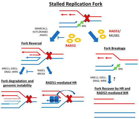 During DNA replication, cells can incur DNA damage. This damage can take place at the replication fork site, leading to a stall and, if prolonged, a fork collapse. Cells have a number of mechanisms to recover from DNA lesions that stall DNA replication forks [22,23]. These recovery mechanisms fall into the categories of damage bypass, fork reversal, and fork breakage [23]. RAD52 seems to have important roles in solving these types of stress-replication structures both upstream and downstream of the fork replication remodeling [23].