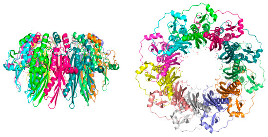 Given the significant difference in sequence length, it is surprising that both the N-terminal form of RAD52 and RAD52 FL form ring-shaped oligomers with similar diameters (around 10 nm) [51,52,53,64]. The first ring-model structure of the full-length RAD52 was built by Kagawa and colleagues [49], merging information from RAD52’s N-terminal structure with rough information obtained from dynamic light scattering (DLS), scanning transmission electron microscopy (STEM), and analytical ultracentrifugation (AUC) data on the full-length protein [51,52]. The heptameric ring model of RAD52 FL was built on indirect experimental evidence and two main speculations. First, if RAD52 (1–212) monomers fit in a heptameric ring, the distance between β- β- β-α folds would increase by 1 nm. Second, it was assumed that if the RAD52 FL monomer-monomer interfaces comprised β-barrel structures, then the difference in distance between neighboring monomers could fit two β-sheets better than the RAD52 (1–212) oligomeric structure. Notably, several structure-based prediction techniques allowed researchers to identify possible β-sheet structures in the limited disordered region of the N-terminal portion of RAD52 (1–212) (Val23 to Phe26), Gln221 to Val343, and downstream of the residue Ser346 [49]. As already mentioned above, work has recently been published reporting the 3.5 Å cryo-EM structure of full-length RAD52, suggesting that the oligomerization state of full-length RAD52 is undecameric, as for the N-terminal truncated form of the protein, with, however, a disordered C-terminal domain [55].