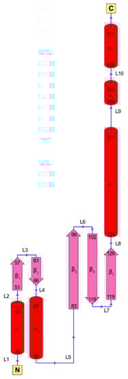 Schematic representation of RAD52 (1–212) monomer folding. Rods and arrows indicate helices and strands, respectively.