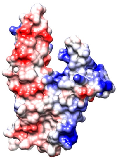 Schematic representation of RAD52 (1–212) monomer surface electrostatic potentials (PDB 1KN0). The representation was carried out using the Coulombic tool of UCSF Chimera, where −10 was set as the minimum (red) and 10 was set as the maximum (blue).