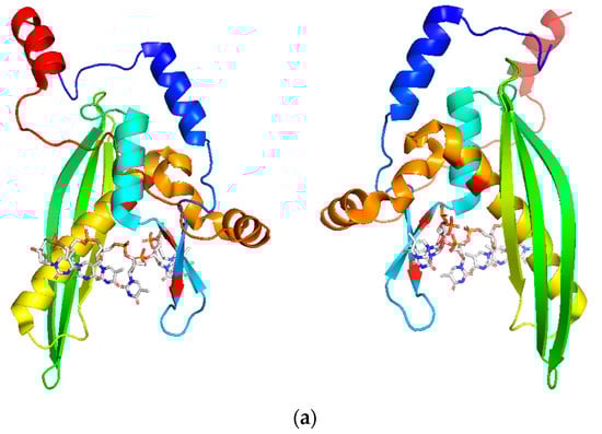 (a) Two views of the RAD52 (1–212) monomer in complex with an ssDNA molecule inside its inner binding cleft (PDB 5XRZ); (b) two views of the RAD52 (1–212) monomer in complex with an ssDNA molecule inside its outer binding cleft (PDB 5XS0). Structures were prepared using UCSF Chimera software.
