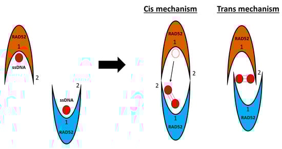 Notably, in 2010, Grimme and colleagues studied DNA-RAD52 interaction mechanisms and postulated two possible mechanisms for homology search, both cis and trans (Figure 9). In the cis mechanism, a portion of one DNA strand can emerge from the deep inner binding groove and be temporarily placed in the second DNA-binding site of the second interacting nucleoprotein. In the trans mechanism, both DNA strands can be pulled out from the inner binding site and moved up to the secondary binding sites of their respective rings to start the homology search and annealing [72]. Notably, the most effective annealing of DNA strands occurs between two RAD52-ssDNA nucleoprotein complexes and not between RAD52-ssDNA and protein-free DNA [72].