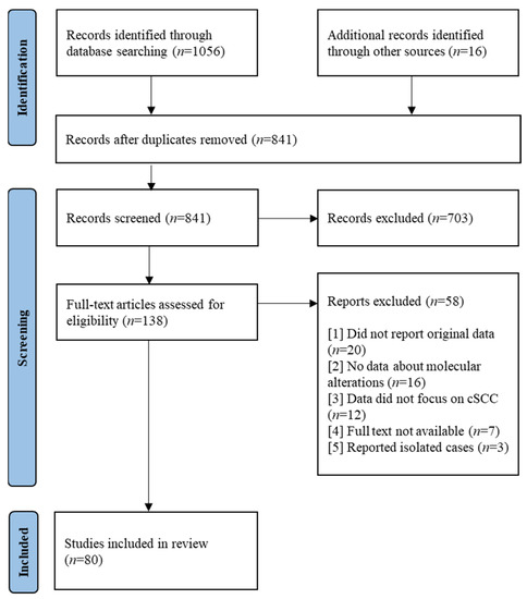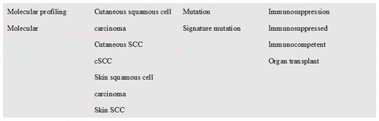 The retrieved literature was screened by two independent authors (DAT, OCC) using titles and abstracts for inclusion. In situations in which the suitability of an article was uncertain, an assessment of the full text was carried out and discrepancies were resolved through a vote of consensus. Articles were selected based on the following inclusion criteria: (1) being written in the English language, (2) having an emphasis on cSCC, and (3) containing data focusing on the molecular profiling of cSCC. Articles were excluded for the following reasons: (1) not reporting original data, (2) having no data about molecular alterations, (3) having data which did not focus on cSCC, (4) the full text was not available, or (5) reporting on isolated cases. Human cell lines and representative animal models were not excluded. Additional articles found after the completion of the full-text review of the selected articles were added to our review if they met the eligibility criteria, did not meet the exclusion criteria, and were not duplicates.