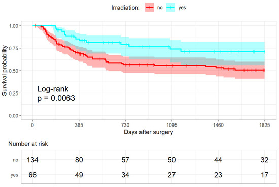 An amount of 56/134 in the non-irradiated (41.8%) and 15/66 patients (22.7%) in the irradiated group had an event within five years after surgery (HR 0.37 [0.2–0.69]; p-value: <0.001; Figure 3). Here, the post hoc calculation showed a power of 91.92%. In particular, fewer lymphatic node metastases were seen in the irradiated group (non-irradiated 33/132 (25%) versus irradiated 8/66 (12.1%); HR 0.34 [0.15–0.77]; p-value: 0.01). There were also significantly more local recurrent diseases in the non-irradiated group (37/134 (27.6%) versus 10/66 (15.2%); HR 0.41 [0.19–0.89]; p-value: 0.02).