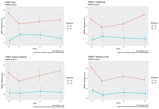 Development of differences in “pain”, “swallowing”, “speech problems”, and “opening mouth” using EORTC QLQ-C30 H&N 35 module between the non-irradiated and the irradiated group.