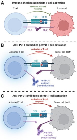 The PD-1/PD-L1 interaction is a critical pathway in the regulation of the immune response. PD-1 (Programmed cell death protein 1) is a receptor expressed on the surface of T cells, while PD-L1 (Programmed death-ligand 1) is a ligand expressed on the surface of various cells, including cancer cells. This interaction helps to prevent autoimmunity by preventing the immune system from attacking healthy cells [17,18]. However, in some cancers, increased expression of PD-L1 inhibits immunoediting through exhaustion of antitumor cytotoxic T cells, leading to the cancer cells evading immune detection and destruction [17,19,20] (Figure 1A). Targeting the PD-1/PD-L1 interaction with immune checkpoint inhibitors, such as pembrolizumab and atezolizumab, can help to reactivate the immune response against cancer cells and improve the efficacy of cancer treatments. Pembrolizumab is an anti-PD-1 antibody that blocks the ability of PD-1 to inhibit T-cell activation [21] (Figure 1B), while atezolizumab selectively binds to PD-L1 to stop the PD-1/PD-L1 interaction [22,23,24] (Figure 1C). Under normal circumstances, Pembrolizumab and atezolizumab target the repressed immune system to re-activate the antitumor immune response [25]. This approach differs from conventional cytotoxic treatments that target cancer cell proliferation and is also resilient to mutational changes in the tumor itself [26,27,28,29,30]. In addition, the effectiveness of immune checkpoint inhibitors, such as pembrolizumab and atezolizumab, may be influenced by the immunological characteristics of the tumor. Immunologically hot tumors with high levels of immune cell infiltration and high mutational load are more likely to respond to checkpoint inhibitors by reactivating the antitumor immune response. In contrast, immunologically cold tumors with low levels of immune cell infiltration and low mutational load are less likely to respond to checkpoint inhibitors alone. Combination therapies that can convert cold tumors into hot tumors by increasing tumor antigen presentation, stimulating immune cell infiltration, or altering the tumor microenvironment are being investigated to improve the efficacy of checkpoint inhibitors in these tumors. Overall, targeting the PD-1/PD-L1 interaction with immune checkpoint inhibitors offers a promising approach to cancer treatment, particularly in immunologically hot tumors.