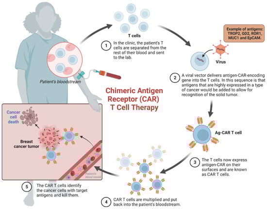 CAR-T cell therapy is an emerging cancer immunotherapy approach that involves extracting the patient’s own T cells, genetically modifying them to attack the cancer, and then reintroducing the altered T cells back into the patient’s body (Figure 2). While CAR-T cell therapy has proven effective in hematologic malignancies and has been FDA approved to treat such cancers [41,42,43], it has yet to demonstrate the same level of success in treating solid tumors. This is partly due to several characteristics of solid tumors, such as their heterogeneity, toxicities, a hostile tumor microenvironment, and limited infiltration of immune cells [44,45,46]. Nevertheless, research is progressing towards identifying unique antigens in solid tumors that can be targeted by CAR-T cells [47]. In TNBC, some promising targets include TROP2 [48], GD2 [49], ROR1 [50], MUC1 [51,52], and EpCAM [53,54]. These antigens not only have high expression in breast cancer [47], but have also shown promising results in CAR-T experimental models. In addition, fourth generation CAR-T cells (TRUCKS, T-cell redirected for universal cytokine-mediated killing) are being developed to improve the effectiveness of CAR-T cell therapy for solid tumors [55]. While many clinical trials are currently exploring the use of different CAR-T cells for the treatment of breast cancer, results are still under review.