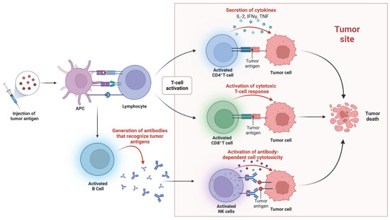 Cancer Vaccines Activate the Immune System to Target Tumor Cells. Cancer vaccines introduce tumor antigens (proteins found on the surface of cancer cells) into antigen-presenting cells (APCs), such as dendritic cells, which then activate CD8+, CD4+, and B cells to mount an immune response against cancer cells. CD8+ T cells, also known as cytotoxic T cells, are responsible for killing cancer cells directly. CD4+ T cells, also known as helper T cells, help activate and coordinate the immune response by releasing cytokines that attract other immune cells to the site of the tumor. B cells, another type of immune cell, produce antibodies that can target cancer cells. Antibodies can bind to tumor antigens on the surface of cancer cells, marking them for destruction by other immune cells or activating complement proteins that lead to cell death.