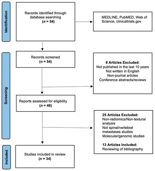 A systematic search of the major electronic databases (PubMed, MEDLINE, Web of Science, and clinicaltrials.gov, accessed on 31 December 2022) was conducted in concordance with the Preferred Reporting Items for Systematic Reviews and Meta-Analyses (PRISMA) guidelines [,] using keywords and Medical Subject Headings (MeSH), or both, for the following key terms: (“bone” OR “vertebral” OR “spinal”) AND (“tumour” OR “lesion” OR “malignancy” AND (“radiomics”, OR “machine learning”, OR “artificial intelligence”, OR “deep learning”). Two authors (W.O. and Y.L.T.) performed an independent review of the collected references and selected the appropriate studies for detailed full-text screening.