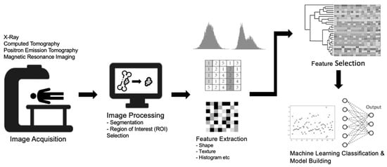 Machine learning represents a subset of AI where models are trained for the prediction of outcomes using datasets with known ground truth, from which the machine “learns”. The developed AI model can then apply its new knowledge to predict outcomes in previously unseen datasets []. Radiomics is a new division of machine learning which involves converting the information stored within medical images into measurable and quantifiable data []. The information obtained can then be used to aid radiologists and clinicians in the assessment of benign and malignant lesions by analyzing and utilizing additional details beyond that of visual interpretation (inferable by the human eye) [,]. When radiomics is combined with additional clinical and qualitative imaging data or both, it has the potential to guide and optimize clinical decision-making, including improved lesion detection, classification, prognostication, and enhanced treatment response assessments []. In general, the typical workflow for developing a radiomics model can be divided into the following steps (Figure 2): image acquisition, data selection (image input), segmentation, image feature extraction within the curated regions of interest (ROIs), exploratory analysis with feature selection, and modelling []. The models should then be validated using test sets (preferably using both internal and external data) to evaluate their performance [].