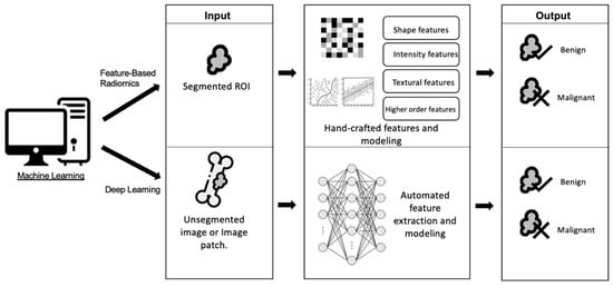 The two most common machine learning methods (Figure 3) are radiomics-based imaging feature analysis and convolutional neural networks (CNN). Feature-based radiomics techniques involve the extraction of various handcrafted features, which can then be included in a training set for AI-based imaging classification []. On the other hand, CNNs utilize deep learning to extract useful imaging features by learning their patterns, classifying data directly from input images [], and transforming them into useful outputs [,]. This results in the ability to detect and process distinct diagnostic patterns and imaging features beyond that of human readers, which are then used for various applications including lesion detection, characterization, and providing prognostic information [].