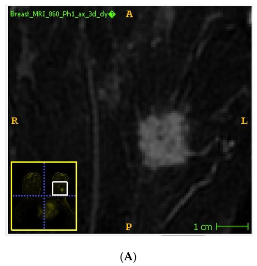 A public dataset of breast MRI examinations was used, freely available at: https://wiki.cancerimagingarchive.net/plugins/servlet/mobile?contentId=70226903#content/view/70226903 accessed on 3 May 2022 [16]. The database includes 1150 consecutive breast cancer patients who underwent pre-operative breast MRI examinations from the 1 January 2000 to the 23 March 2014. Patients with no available Oncotype DX score were excluded. Oncotype DX score was considered as positive if greater than 16 in <50-year-old patients and greater than 26 in >50-year-old patients [17].