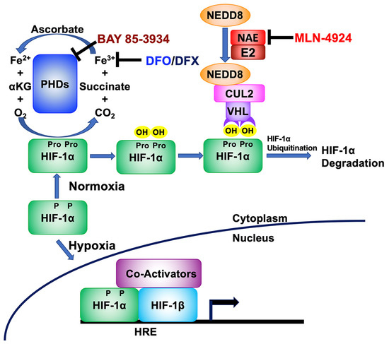HIF-1α can be stabilized by a variety of drugs that target this pathway toward degradation (Figure 1). For example, Deferoxamine (DFO) and Deferasirox (DFX) are FDA-approved drugs that bind iron (reviewed in [30]), thereby chelating away one of the three co-factors required by PHDs to hydroxylate HIF-1α. BAY 85-3934 (Molidustat) inhibits the activities of the three HIF PHDs, probably via direct binding to these proteins [31]. MLN-4924 (Pevonedistat) inhibits the activity of the NEDD8-activating enzyme (NAE), thereby preventing NEDDylation of the Cullen 2 (Cul2) E3 ubiquitin ligase that complexes with VHL to ubiquitinate HIF-1α (reviewed in [32]).