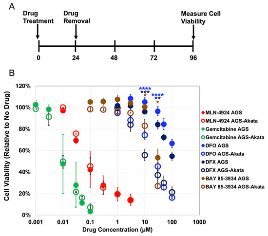 Cell viability of EBV(+) AGS-Akata versus EBV(-) AGS cells following incubation with a variety of hypoxia mimics versus gemcitabine. (A) Protocol used for treating cells for 24 h with the indicated agents followed by assaying for cell viability at 96 h. (B) Effects of various dosages of gemcitabine (green), MLN-4924 (red), DFO (blue), DFX (navy), and BAY 85-3934 (brown) on cell viability of AGS (closed circles) and AGS-Akata (open circles). Error bars indicate ± S.E.M.; n = 3–9; p-values for EBV-positive cells compared to AGS cells: *, p ≤ 0.05; **, p ≤ 0.005; ***, p ≤ 5 × 10−4; ****, p ≤ 5 × 10−5.