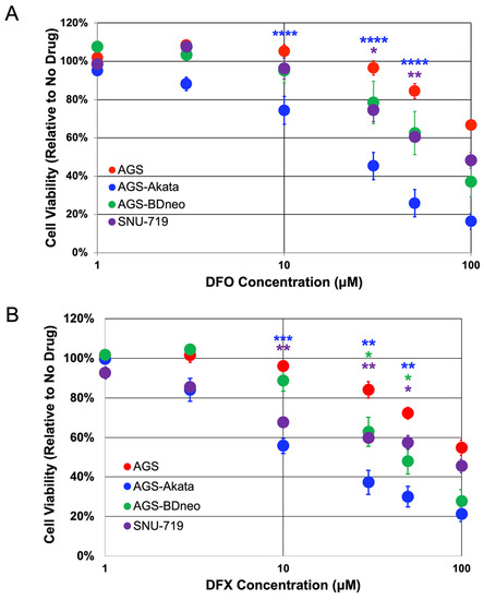 Cell viability of EBV-positive gastric cancer cell lines treated with DFO and DFX. EBV-positive cell lines AGS-Akata (blue), AGS-BDneo (green), and SNU-719 (purple) and EBV-negative AGS cells (red) were treated with the indicated concentrations of DFO (A) or DFX (B) for 24 h and then without drug for an additional 72 h. n = 4–9; *, p ≤ 0.05; **, p ≤ 0.005; ***, p ≤ 5 × 10−4; ****, p ≤ 5 × 10−5 for EBV+ cells compared to EBV- AGS cells.