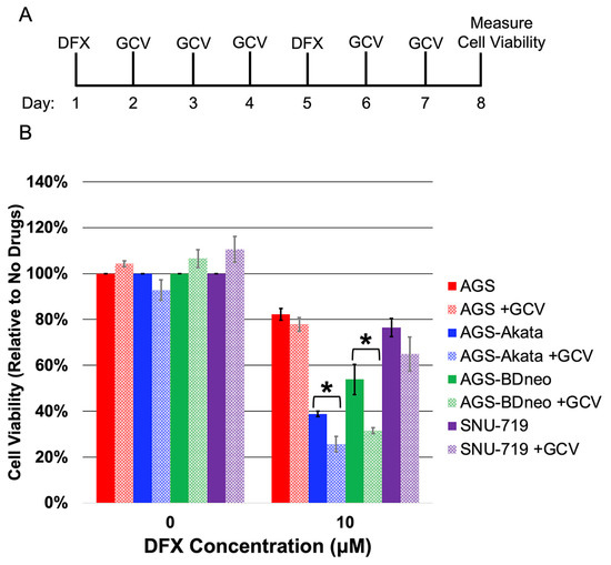 Ganciclovir enhances preferential killing of EBV-positive gastric cancer cells by DFX. (A) Schematic showing protocol used to examine effects of addition of GCV on killing by DFX. Cells were incubated for 24 h with 10 µM DFX (or DMSO as the diluent control) on the 1st and 5th days of the experiment and 20 μg/mL GCV (or the HCl diluent control) on each of the other days. Cell viability was determined on day 8. (B) Cell viability of EBV-negative AGS (red) cells and EBV-positive AGS-Akata (blue), AGS-BDneo (green), and SNU-719 (purple) after incubation with or without the indicated drugs as shown in panel A. Data for each cell line were normalized to the percentage cell viability observed when these cells were incubated in parallel with neither drug. Error bars represent ± S.E.M.; n = 3; *, p ≤ 0.05.