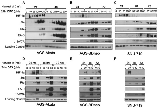 In Figure 5, we show that expression of EBV lytic antigens is also induced at these minimally toxic dosages. For example, a 24 h incubation with 25 µM DFO was sufficient to induce high-level accumulation of EA-D (an EBV early-lytic gene product) as well as Zta in AGS-Akata and AGS-BDneo cells by 48 h (Figure 5A and 5B, respectively). Similar results were observed with 30 µM DFX (Figure 5D and 5E, respectively). SNU-719 cells required higher concentrations of the drugs, with accumulation of the EBV lytic antigens peaking later (Figure 5C,F). Also noteworthy is that a 24-h treatment with 30 µM DFX or 50 µM DFO was sufficient for high-level accumulation of p18 (an EBV late-gene product) by 48–72 h in all three EBV-positive cell lines. Thus, EBV reactivation induced by a 24-h incubation with either drug leads to a complete cycle of lytic EBV gene expression within 48–72 h despite the drug and HIF-1α no longer being present (Figure 5A–F). Therefore, we conclude that these drugs are only needed briefly at these lower concentrations to initiate EBV’s lytic replication cycle.