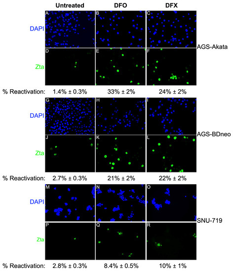 Cells derived from tissue culture were seeded onto glass coverslips in 10-cm dishes at a density of 1 × 106 cells/dish and incubated for 24 h with or without the indicated amount of DFO or DFX. The cells were then washed in PBS, fresh media lacking drug was added to the cells, and the cells were incubated for another 24 h for AGS-Akata and AGS-BDneo cells and another 48 h for SNU-719 cells. The cells were then fixed by incubation in a 4 °C solution of acetone:methanol (1:1). After blocking for ½ h at room temperature in PBS containing 5% milk and 5% donkey serum (MilliporeSigma), the cells on the coverslips were incubated overnight at 4 °C with primary antibody to Zta (BZLF1, 1:100, Santa Cruz Biotechnology, sc-53904) diluted in the blocking solution described above. After washing in PBS, the cells were then incubated for 1 h at room temperature with a secondary antibody (donkey anti-mouse IgG with Alexa Fluor 488, 1:500, Invitrogen, Thermo Fisher Scientific, #37114). Cells were incubated in 1 μg/mL Hoechst stain (MilliporeSigma) for 15 min to detect nuclei, washed with PBS, and the coverslips were mounted onto slides using Vectashield mounting medium (Vector Labs). The slides were imaged using a Zeiss AxioImager M2 microscope with AxioImager Software version 4.8.2.