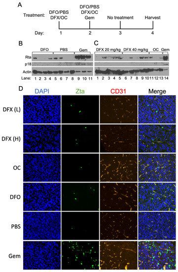 Immunoblot analysis of the harvested xenograft tumors for immediate-early (Rta) and late (p18/VCA) EBV lytic antigens revealed, as expected, that gemcitabine induced EBV reactivation efficiently, well above the background of Rta and p18 observed in tumors from mice injected with PBS as a control (Figure 7B,C). Immunofluorescence staining for Zta in flash-frozen sections of these tumors confirmed these findings (Figure 7D). CD31, a blood vessel marker, was used to show tumor architecture. Similar analyses of tumors taken from mice treated with DFO or DFX indicated the presence of Zta and Rta in many of the samples, but at significantly lower levels than observed in the gemcitabine-treated tumors (Figure 7B–D).