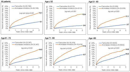 Kaplan–Meier analyses were performed to show the cumulative incidence of antiresorptive drug prescription for tamoxifen and aromatase inhibitors, separately, for four age groups (≤50, 51–60, 61–70, 71–80, and >80 years). A univariable Cox proportional hazards regression model was also used to estimate the relationship between initial drug (aromatase inhibitors versus tamoxifen) and antiresorptive drug prescription. p-values < 0.01 were considered statistically significant. Analyses were carried out using SAS version 9.4 (SAS institute, Cary, NC, USA).