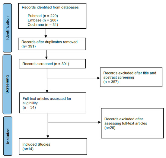 We conducted a comprehensive review of the literature encompassing PARPi in prostate cancer. This systematic review was conducted according to the PRISMA (Preferred Reporting Items for Systematic Reviews and Meta-Analyses) guidelines. In November 2022, we conducted a search in the PubMed, Embase and Cochrane databases. MeSH terms and keywords “PARP inhibitors and prostate cancer” were used in searches in PubMed, Embase and Cochrane. In the initial search, we obtained 184, 278 and 30 articles in the PubMed, Embase and Cochrane databases, respectively. The initial queries were limited to papers published between 2012 and 2022. We then limited the search to papers that were written in English, or papers with available English translation. Duplicates were removed from the remaining selection. Two of the authors conducted screening of the remaining 391 publication abstracts. Case reports, editorials, reviews, letters, retrospective studies were excluded from the PubMed, Embase and Cochrane queries. Thirty-four articles were then chosen for full-text reading. We selected randomized controlled trials to attempt to limit potential biases and confounders. We excluded phase I randomized controlled trials. We selected phase II and III clinical trials in men with metastatic prostate cancer for their greater clinical impact and larger cohort sizes. In selected trials, patients in the intervention group were to receive a PARPi either alone or with other potentially complementary antineoplastic agents. Regular consensus meetings were held by the authors for discussion and information extraction from the selected manuscripts. Selected trials had efficacy and toxicity data. Efficacy data were reflected through outcomes such as objective response rates (ORR), radiologic progression-free survival (rPFS), disease-free survival (DFS) or overall survival (OS). Evaluation of side effects by a standard severity grading system such as the common terminology criteria for adverse events (CTCAE) was also required. All disagreements about selection and study inclusion between authors were discussed and resolved at consensus meetings with all authors (Figure 1).