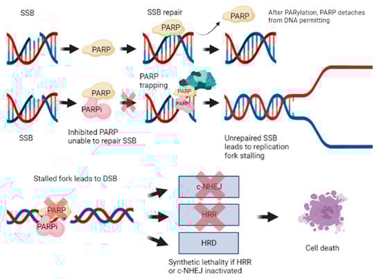 Rather, it was theorized that synthetic lethality may be due to stalled replication forks converted to DSB. Indeed, SSBs that remain unrepaired become DSB when the replication fork moves through; however, these DSBs are one-ended, hence they cannot be repaired by NHEJ, making the cells dependent on homologous repair. Accumulation and inability to repair these DNA DSBs in the context of absent or impaired HRR apparatus can culminate in cell death [,]. In fact, synthetic lethality is a phenomenon that occurs when an error in either one of two genes has little effect on an organism, whereas a combination of defects in both genes results in its death (Figure 2).