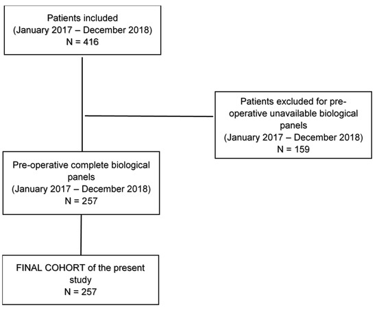 Flow chart of the study. In this study, we analyzed the long-term outcomes of the first part (257 patients) of a 1077 patient series (January 2017–August 2021) [21], undergoing anatomical surgical resection for non-small-cell Lung Cancer. We included all patients undergoing anatomic lung resection in the period January 2017–December 2018, with pre-operative available biological panels performed in our departmental laboratory.