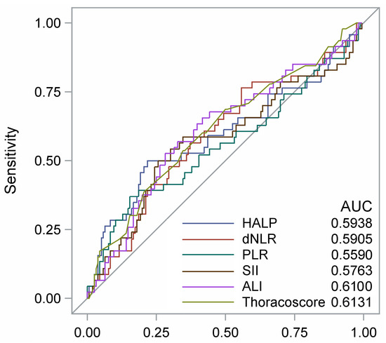 Receiver operating characteristic (ROC) curves for 3-year mortality of the Thoracoscore and of selected inflammatory parameters. HALP: hemoglobin, albumin, lymphocyte, and platelet score; NLR: derived neutrophil-to-lymphocyte ratio; PLR: platelet-to-lymphocyte ratio; SI: systemic immune-inflammation index; ALI: advanced lung cancer inflammation index. Best cut-off values (Youden index): HALP (32.2); NLR (2.29); PLR (196); SII (809); ALI (34.9); Thoracoscore (2.3).