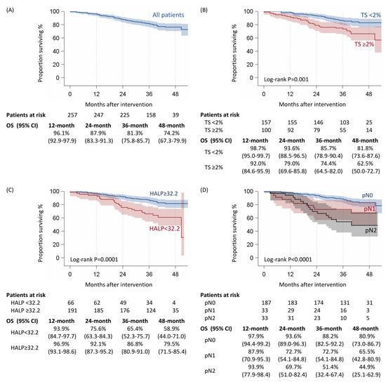 Overall survival of 257 patients who underwent lung cancer surgery overall (A), according to Thoracoscore (B), HALP (C), and pN (D).