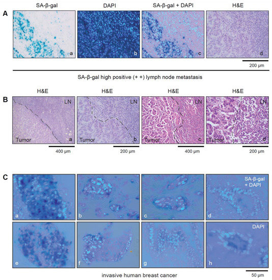 Previously we reported that senescent cells exist in primary invasive breast carcinomas [38]. To address whether senescent tumor cells also exist in metastatic breast cancer lesions, tissue sections from primary tumors and their lymph node metastases were collected. For both primary tumor and SLN samples, two consecutive frozen sections were taken immediately after surgery (Figure 1A,B). One was stained intraoperatively with H&E, and the other was used subsequently for SA-β-gal staining (Figure 1A(b,c),B(b,c)). SA-β-gal staining was observed in the primary tumor samples and in the majority of the SLN metastatic lesions. Cytoplasmic staining was generally homogeneous but differed in amount and intensity from sample to sample (Figure 1C(e–h)), with the vast majority of SA-β-gal positive cells being clearly identifiable as tumor cells. However, some patient samples contained few, if any, SA-β-gal positive tumor cells (Figure 1C(g)).
