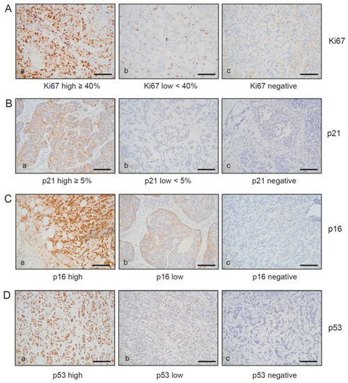 The Ki67 proliferation index and protein expression of p16INK4A, p21Cip1/Waf1, and p53 were quantified on the basis of percentage positivity in at least 500 neoplastic cells counted in the tumor area. Negative, low, and high protein expression levels of p16INK4A, p21Cip1/Waf1, and p53 were defined as follows: p16 and p53 negative < 1% positive cells, p16 and p53 low (+): score 1+ or 2+ ≤ 50% pos. cells or score 3+ or 4+ ≤ 10% pos. cells. p16 and p53 high (++): score 1+ or 2+ > 50% pos. cells or score 3+ or 4+ > 10% pos. cells. p21 negative < 1% positive cells, p21 low (+) < 5% pos. cells, p21 high (++) ≥ 5% pos. cells. Ki67 negative < 1% positive cells, Ki67 low < 40% pos. cells, Ki67 high ≥ 40% pos. cells. For the Ki67 proliferative index and for p16INK4A, p21Cip1/Waf1, and p53 expression, only nuclear reactivity was taken into account. For the assessment of ER and PR staining, strong nuclear staining in one or more tumor cells was considered positive. The immunohistochemical intensity and the percentage of positive cells were used to determine the ER/PR status. HER2 overexpression (3+) was defined as complete and strong membrane staining in more than 10% of the tumor cells. Amplification of HER2 is defined by a HER2:Cep17 ratio of more than 2.0 [41].