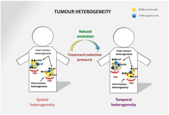 Spatial and temporal heterogeneity in NENs. Neuroendocrine neoplasms generally express SSTR2 on the tumour surface, and are well-differentiated tumours in the majority of cases. However, spatial heterogeneity within the primary tumour may lead to the presence of areas with lower expression of SSTR2 and/or a different Ki-67 index. This heterogeneity is also frequent in metastatic sites and can differ significantly from the primary lesion. The mTOR pathway is also commonly involved in the onset of the disease and is particularly relevant in distant metastases, although over time alternative pathways may be involved in tumour survival. Moreover, temporal heterogeneity that can be linked to treatment selective pressure may lead to significant changes in tumour biology that affect prognosis and survival.