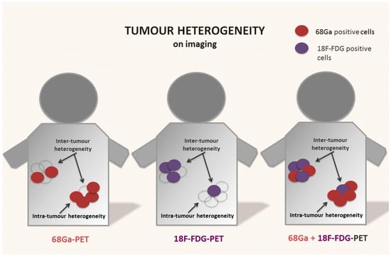 In less differentiated NENs that often co-express SSTRs and glucose-transporters, the addition of flourine-18 fluorodeoxyglucose (18F-FDG)-PET imaging can potentially better assess the intra- and inter-lesional heterogeneity of the tumour by exploring the heterogeneous distribution and uptake of 18F-FDG (Figure 2) [52].