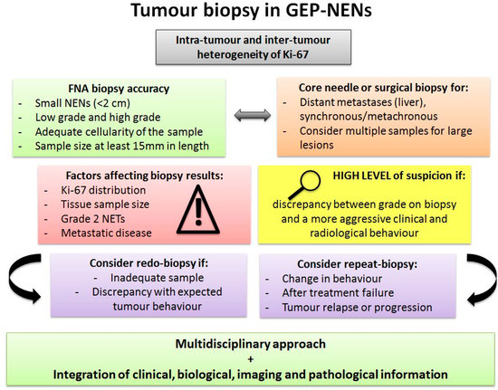 In NENs, random biopsies may not be representative of the whole tumour burden, especially for higher-grade tumours and metastatic disease, which often display a different clinic-pathological pattern from their primary site. More than half of metastatic GEPs and SI-NENs show a higher Ki-67 index on definitive histology and a subsequent change in World Health Organization grade [26,27,28,29,30,31]. There has been controversy over the accuracy of NEN biopsies, as it can be difficult to assess the complexity of the disease on cytological or small tissue samples [83,84]. The assessment of grading by the Ki-67 index can be affected by the size and type of tumour sample, with discordance between biopsy results and definitive histology and the risk of misinterpretation of tumour behaviour [85]. Moreover, it has also been debated that with grade 2 NETs, the tissue sample size and heterogeneity in the intra-tumour distribution of Ki-67 could negatively impact biopsy accuracy in GEP-NENs, as higher-grade tumours show significant clinical and molecular heterogeneity [27,36,86].