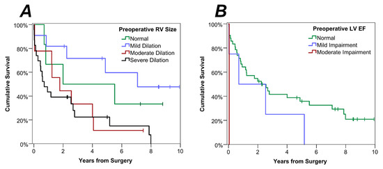 Kaplan-Meier Curves of Survival by Preoperative TTE Parameters. Separate curves were produced for subgroups defined by preoperative (A) RV size and (B) LVEF.
