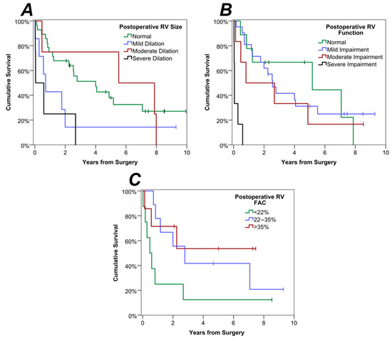 Kaplan-Meier Curves of Survival by Postoperative TTE Parameters. For the plot of postoperative RV FAC, patients were divided into three groups, based on tertiles of the distribution, to visualise the association with postoperative survival. Separate curves were produced for subgroups defined by postoperative (A) RV size and (B) RV function. In (C), patients were divided into three subgroups, based on tertiles of the distribution of postoperative RV FAC.