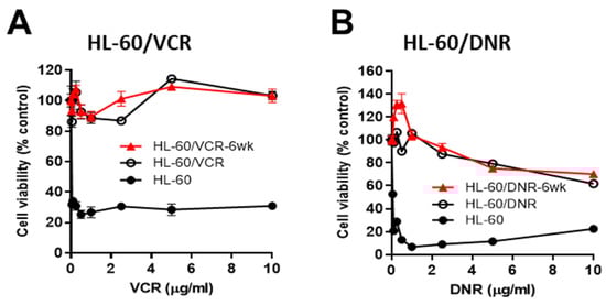 Chemotherapy sensitivity in HL-60 wild-type and in VCR- and DNR-selected counterparts. (A,B), Cells (50,000/well) were seeded into 96-well plates in complete media and exposed to VCR or DNR at the concentrations indicated for 72 h (drug-resistant cells) and 48 h (HL-60 wt cells), after which viability was determined using the MTS assay. The red line indicates chemotherapy sensitivity in HL-60/VCR and HL-60/DNR cells that were cultured in VCR- and DNR-free media for 6-wk prior to assay. Data represent Mean ± SEM, (A,B) N = 6/group.