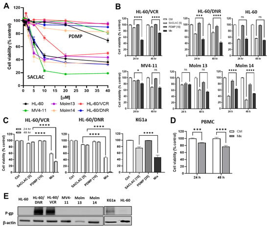 Impact of SACLAC and D-threo-PDMP exposure on viability in drug-resistant and wild-type human AML cell lines. (A) Impact of single agent exposure. Cells (50,000/well) were seeded into 96-well plates and exposed to either SACLAC or D-threo-PDMP for 24 h at the concentrations indicated. Cell viability was determined by PI assay. (B) Effect of single agent and mix regimens on AML cell viability. Exposure times and concentrations as indicated. Viability by PI assay. (C) Confirmation of combinatorial efficacy in HL-60/VCR, HL-60/DNR, and KG-1a cells by cell counting method. Cells (200,000/well) were seeded into 12-well plates in complete media and treated as indicated for the times shown (KG-1a, 24 hr treatment), after which viability was determined by trypan blue exclusion and cell counting. (D) Enzyme inhibitor sensitivity in PBMCs. PBMCs (200,000 cells/well) were seeded into 12-well plates in complete media and exposed to the agents indicated (5 µM SACLAC and 10 µM D-threo-PDMP) for the times shown, after which cell viability was determined by trypan blue exclusion and cell counting. (E) Western blot analysis of P-gp expression in AML cell lines. Numbers in brackets indicate µM concentrations. Mix refers to SACLAC + PDMP at a 1:2 ratio. PDMP refers to D-threo-PDMP. PBMC, peripheral blood mononuclear cells. The uncropped bolts are shown in Supplementary Materials Figure S1. Data represent Mean ± SEM, (A) N = 6/group, (B) N = 6/group, (C) N = 3–6/group, (D) N = 3–6/group. Two-way ANOVA (Tukey’s multiple comparisons test) was used for statistical analysis (* p < 0.05, *** p < 0.001, **** p < 0.0001). ns, not significant.