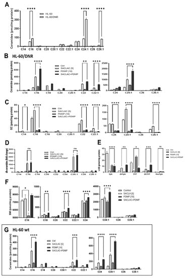 Ceramide levels in HL-60 wt and HL-60/DNR cells and the impact of SACLAC, D-threo-PDMP, and the combination regimen on sphingolipid composition. (A) Ceramide levels in HL-60 wt and drug-resistant HL-60/DNR cells. (B–F) Impact of SACLAC, D-threo-PDMP, and combination in HL-60/DNR cells on levels of (B) Ceramide; (C) Glucosylceramide; (D) dihydro-Ceramide; (E) Long-chain bases; (F) Sphingomyelin; and (G) Ceramide molecular species in HL-60 wt cells treated with SACLAC, D-threo-PDMP, and combination. Cells (6 × 106/10 cm dish in complete media) were exposed to the control (vehicle, DMSO), SACLAC, D-threo-PDMP, or the combination regimen for 24 h, after which cells were harvested, pelleted by centrifugation, washed 3× in cold phosphate-buffered saline, and stored at −80 °C. Lipidomic analysis was conducted by mass spectroscopy as indicated in Methods. Results shown are the average of n = 4 experiments. The dh-ceramides levels are given as fold-change due to their low concentrations. GC, glucosylceramide; dh, dihydro; LCB, long-chain base; SM, sphingomyelin; and PDMP, D-threo-PDMP. Data represent Mean ± SEM, (A) N = 3–5/group, (B–F) N = 3/group, (G) N = 6/group. Two-way ANOVA (Tukey’s multiple comparisons test) was used for statistical analysis (* p < 0.05, ** p < 0.01, *** p < 0.001, **** p < 0.0001). ns, not significant.